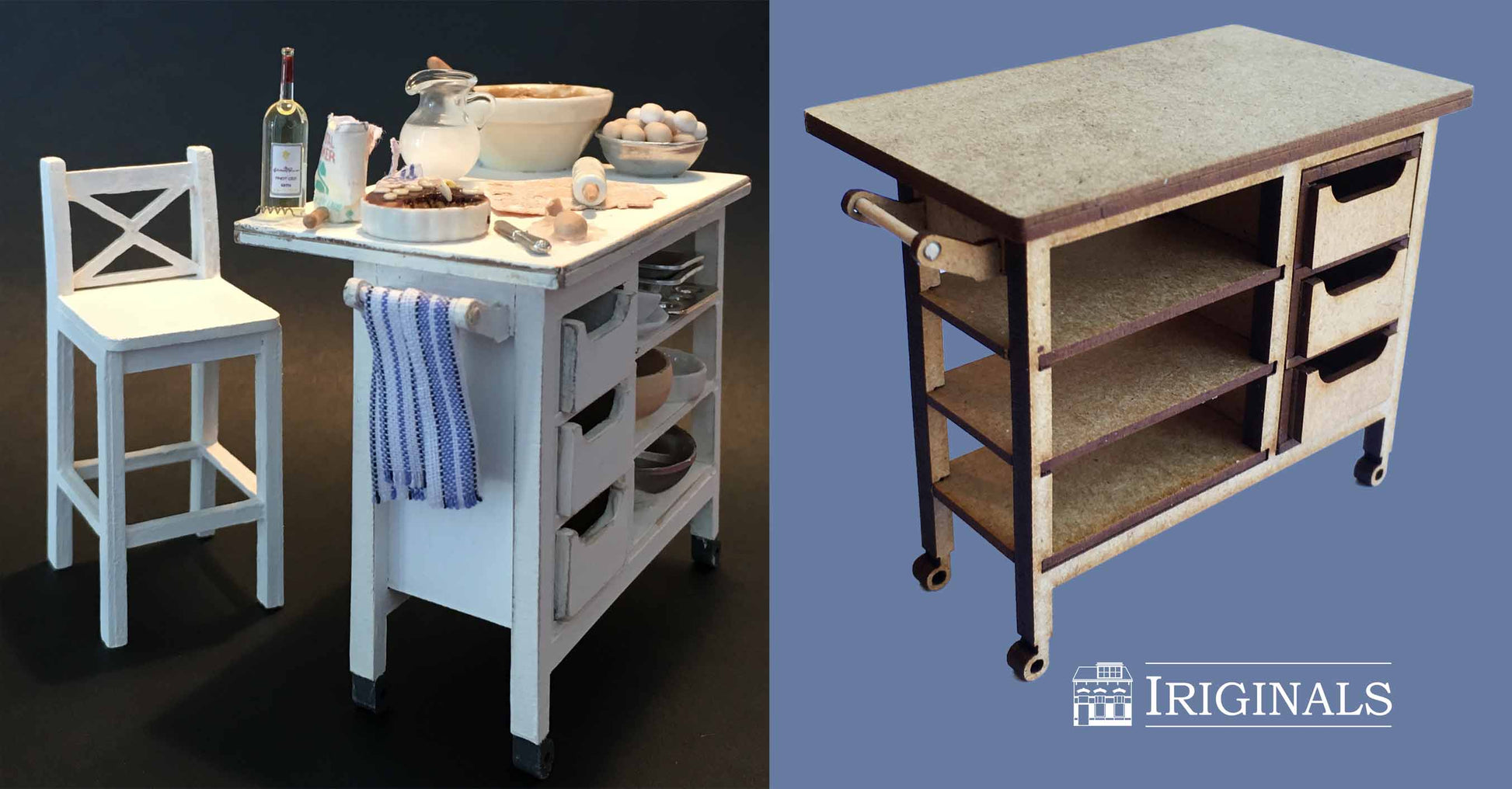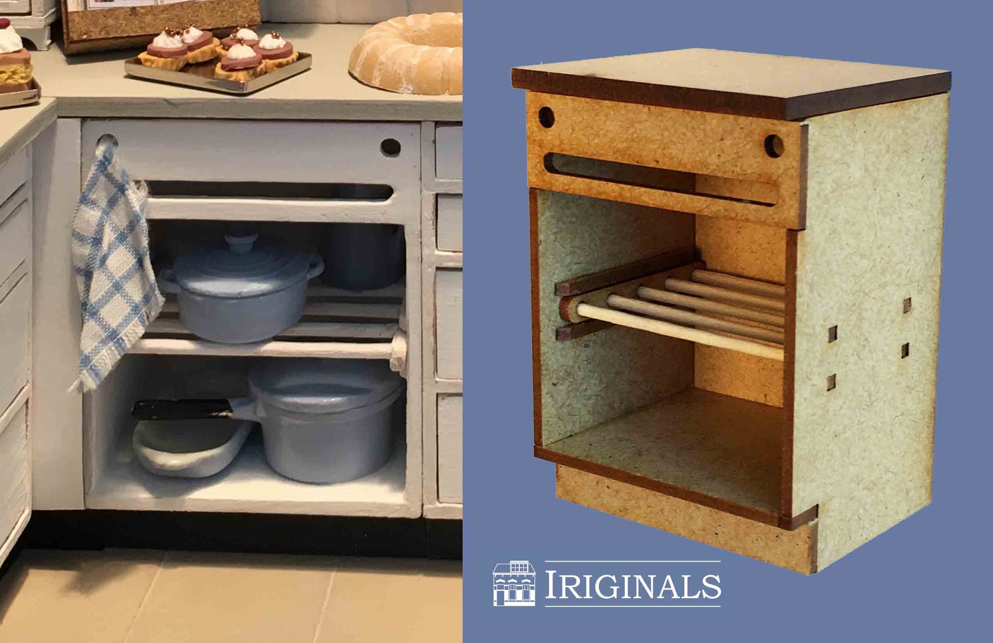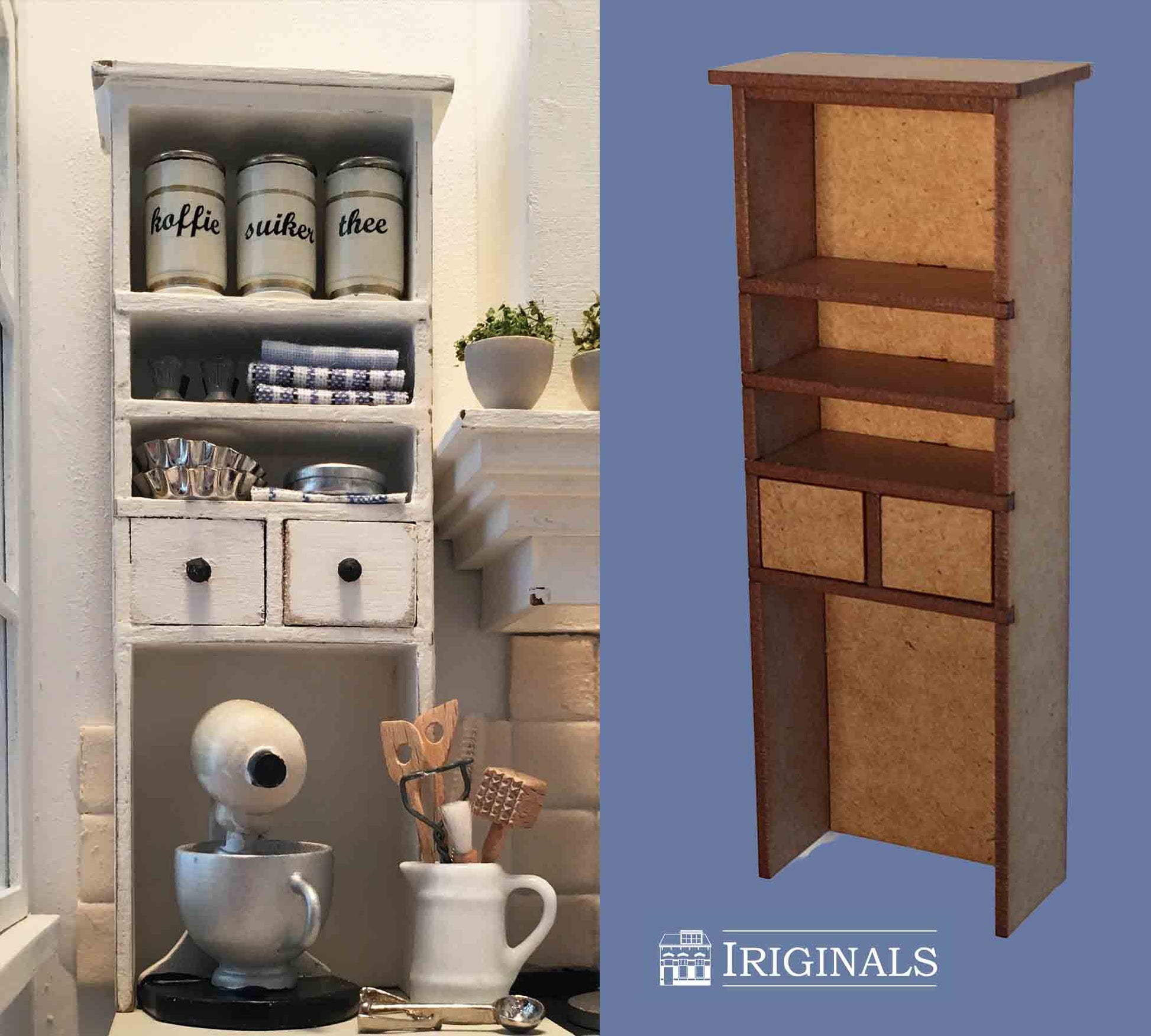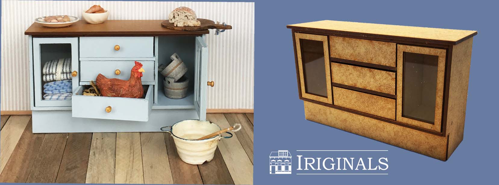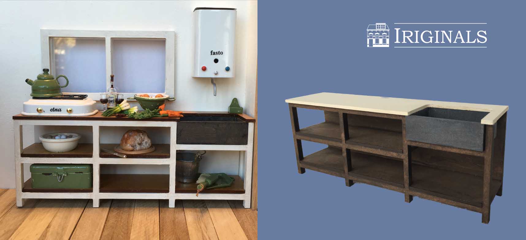 Ons nieuwste project is een Landelijke Keuken. Keukens zijn onverminderd populair bij poppenhuisliefhebbers en wij horen van veel klanten dat er behoefte is aan een 'modulair systeem' waarbij men een keuken geheel naar eigen behoefte kan indelen. Wij zijn aan de slag gegaan met het produceren van 11 verschillende kastjes, aangevuld met diverse andere meubeltjes die óók buiten de keuken kunnen worden gebruikt.