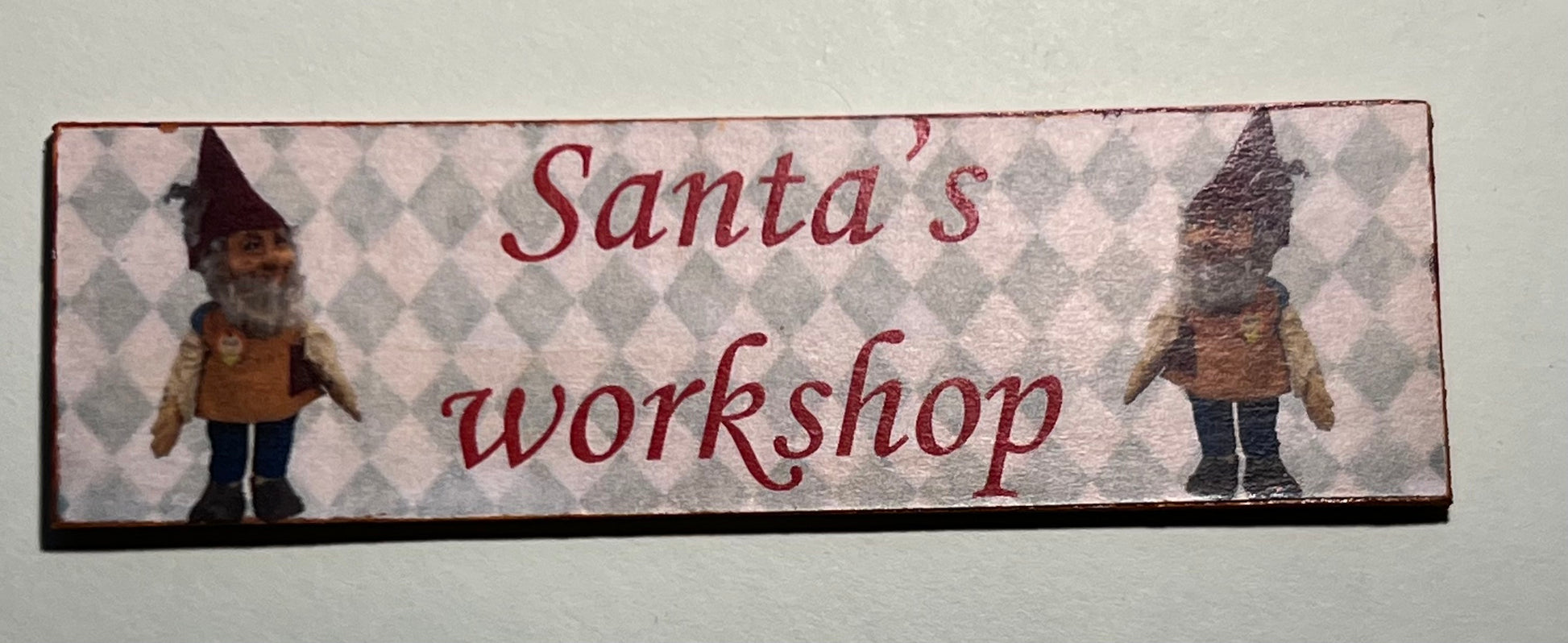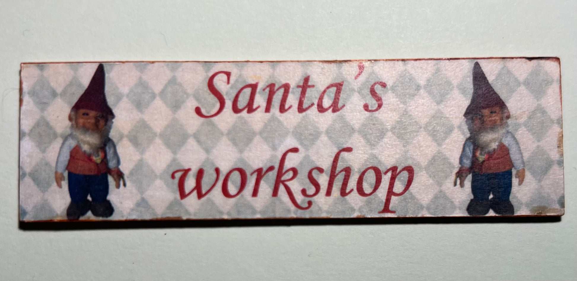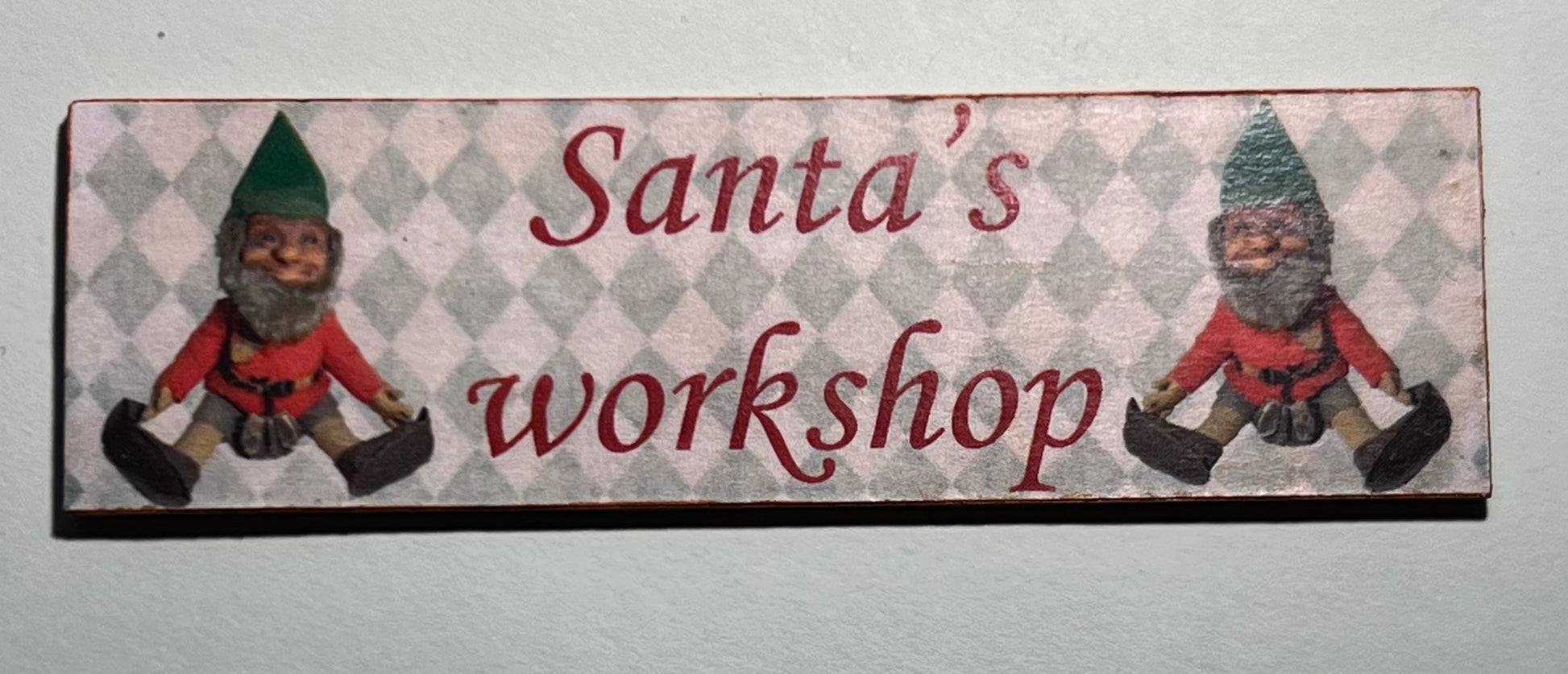 Leuk handgemaakt deco bord " Santa's workshop" met diverse decoratie. 8,5 cm breed 2,5 cm hoog