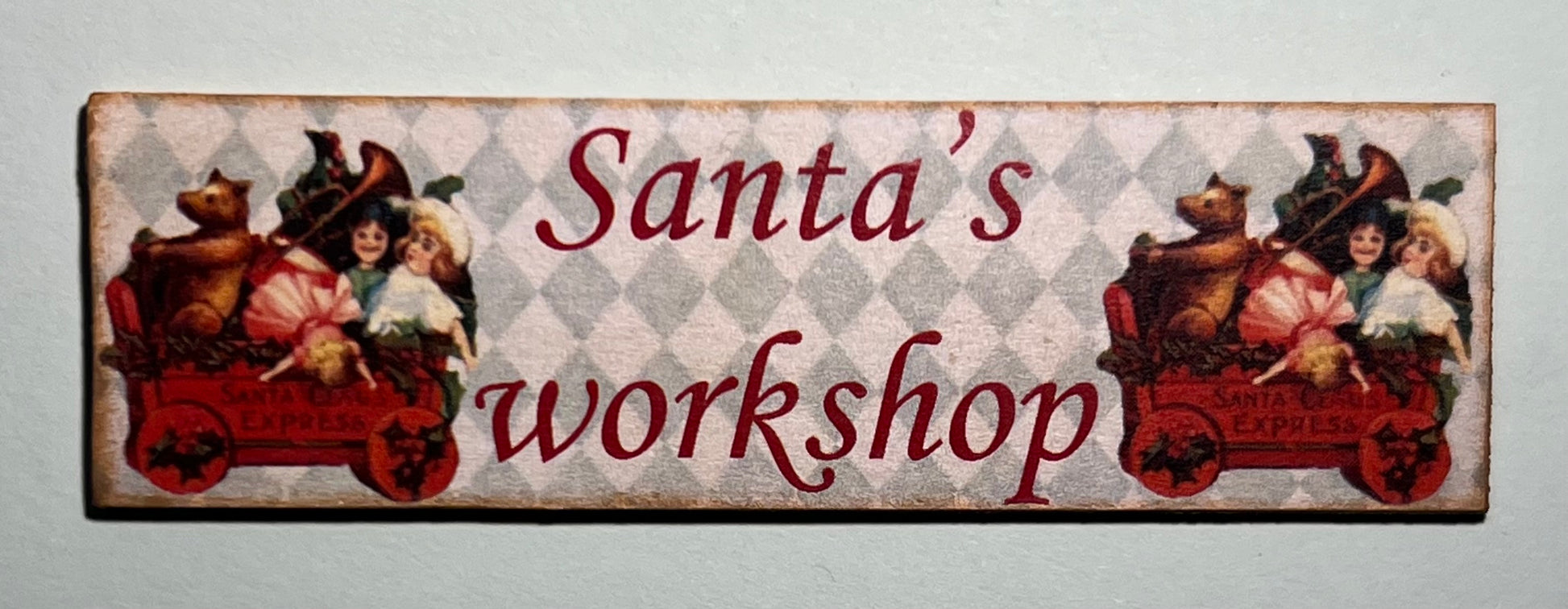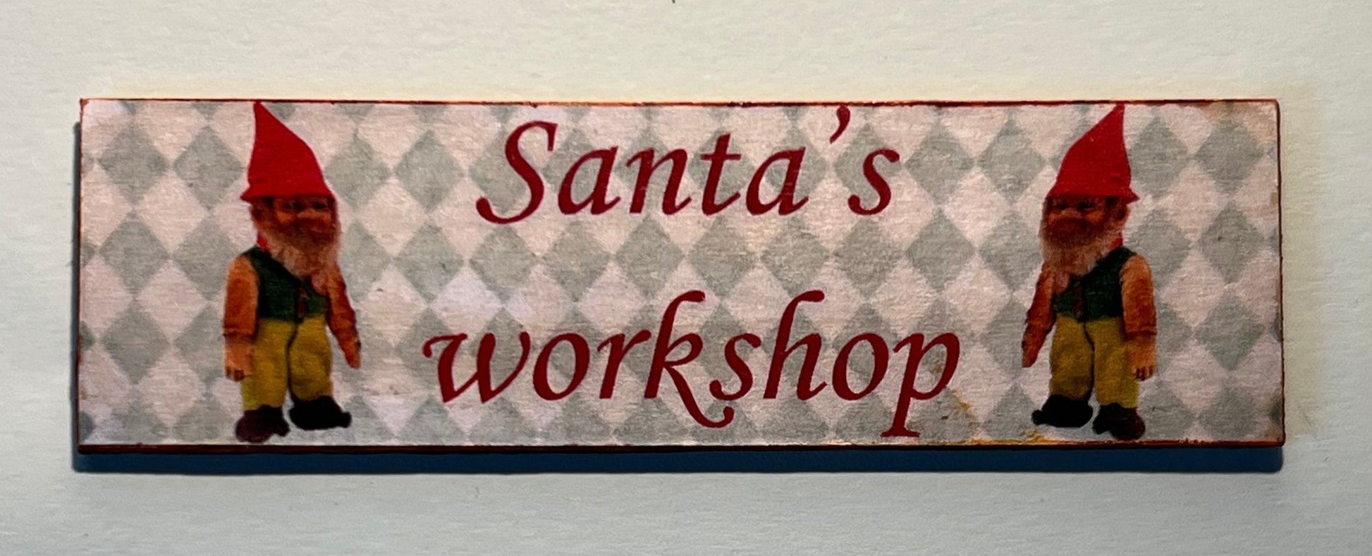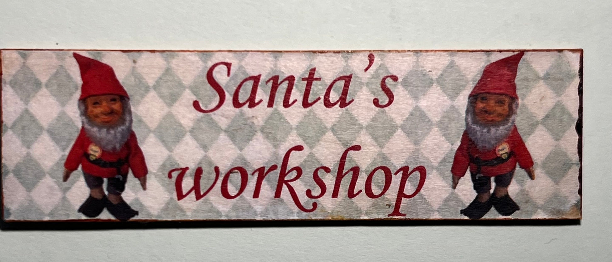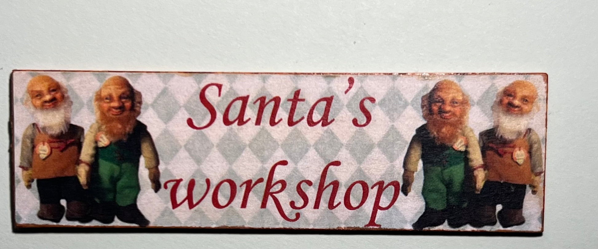 Leuk handgemaakt deco bord " Santa's workshop" met diverse decoratie. 8,5 cm breed 2,5 cm hoog